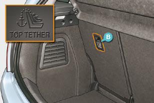 - a ring B , behind the seat, referred to as the TOP TETHER for fi xing the upper strap.