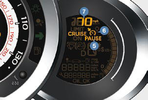 5. Cruise control off/resume indication 6. Cruise control mode selection indication 7. Programmed speed value