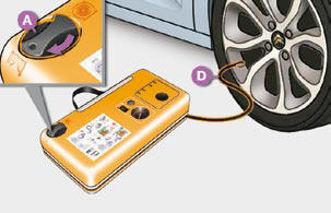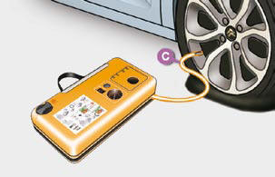 Connect the white pipe C to the valve of the tyre to be repaired.