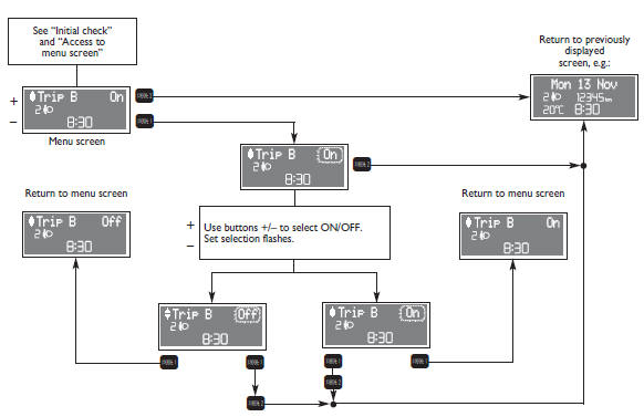 Through this option it is possible to activate (ON) or deactivate (OFF) the Trip B (partial trip) which show “partial mission” information corresponding to: Trip Dist. B, Avg. Consump. B, Avg. Speed B, Time B. For further information see “General trip - Trip B”.