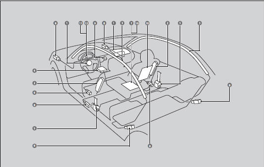 1 Two SRS (Supplemental Restraint System) front airbags. The driver’s airbag is stored in the center of the steering wheel; the front passenger’s airbag is stored in the dashboard. Both are marked SRS AIRBAG.