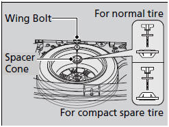 4. Unscrew the wing bolt, and remove the spacer cone. Then, remove the spare tire.